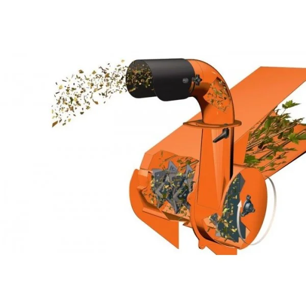 • Les tout nouveaux broyeurs ELIET 4S sont dotés d’un système Turbo Discharge. Cette turbine d’aspiration crée une sorte d’effet de vide qui aspire les déchets verts dans le broyeur puis éjecte les copeaux à l’aide d’un tuyau souffleur orientable. Le flux d’air permanent de ce turbo générateur nettoie en continu le système, ce qui élimine presque tout risque d’obstruction.