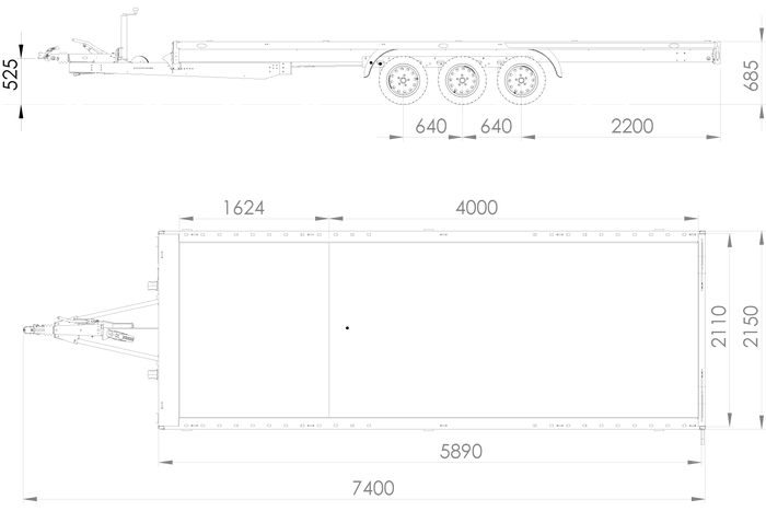 Dépanneuse Unitrailer UNIPLAT 600/3 d’une longueur totale de 7400 mm, dimensions de l’espace de chargement de 5890 x 2110. Poids total : 815 kg. 3 essieux freinés. PTAC max jusqu’à 3 500 kg.