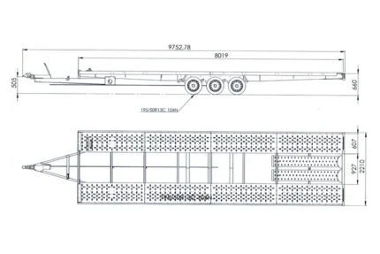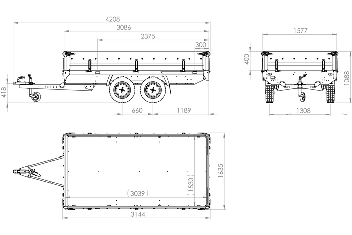 Remorque 2 essieux avec une surface de transport de 304×153 cm. PTAC de 400 à 750 kg. Deux essieux non freinés. Entièrement galvanisé.