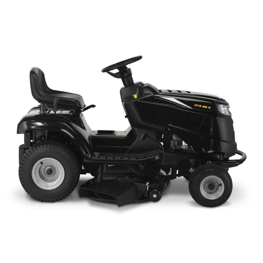 Tondeuse autoportée à transmission manuelle de 98 cm avec moteur Alpina 352 cm3 à OHV et carter de coupe à éjection latérale. Peut également être configurée pour le mulching avec l’achat du kit en option.