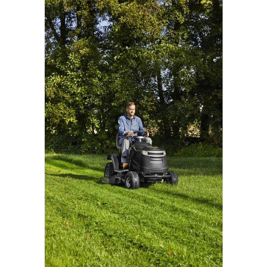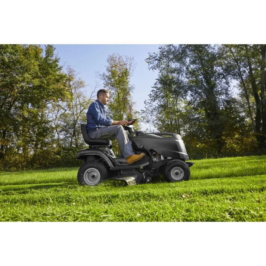 Cette autoportée de 98 cm de coupe peut éjecter latéralement ou faire du mulching et dispose d’un entraînement hydrostatique à pédale. La puissance provient d’un moteur 414cc STIGA. Kit mulching disponible séparément.