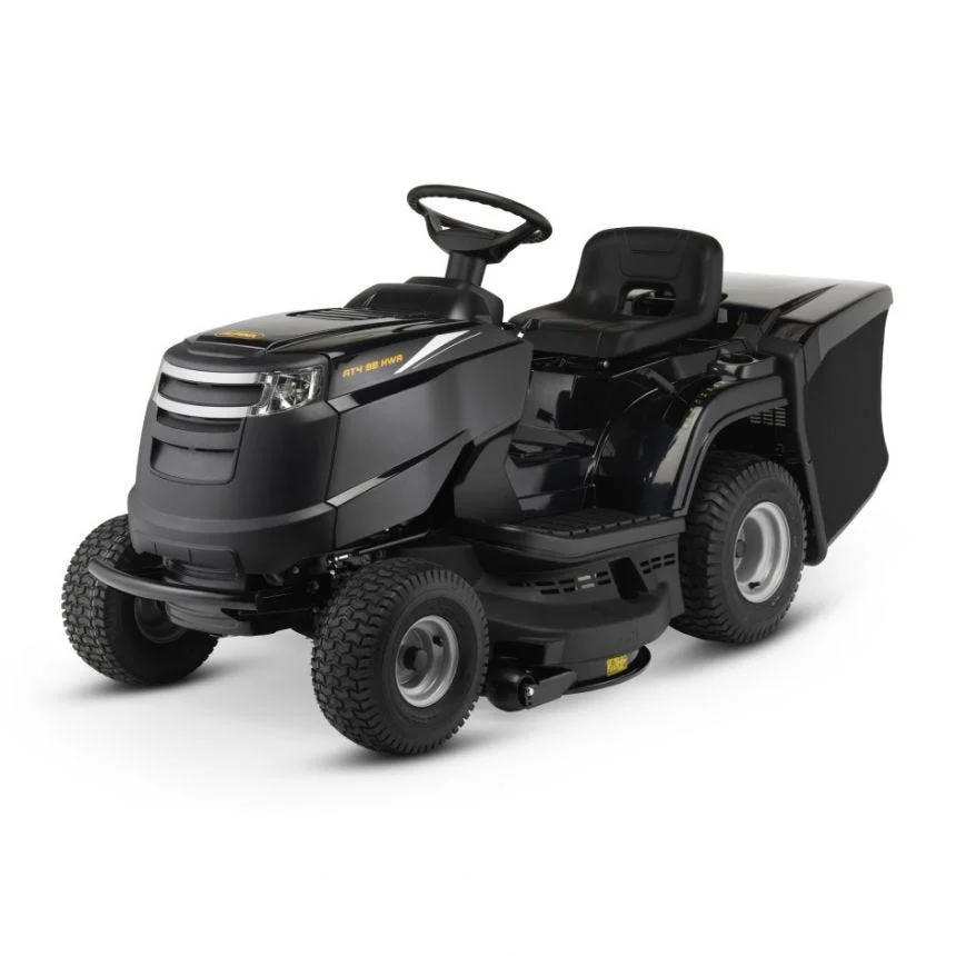 Un entraînement hydrostatique – contrôlé via une pédale – optimise le contrôle et la maniabilité ; Une série de roues de jauge sert à éviter les dommages sur le gazon en empêchant les bords du plateau de coupe de 98 cm de marquer le sol.